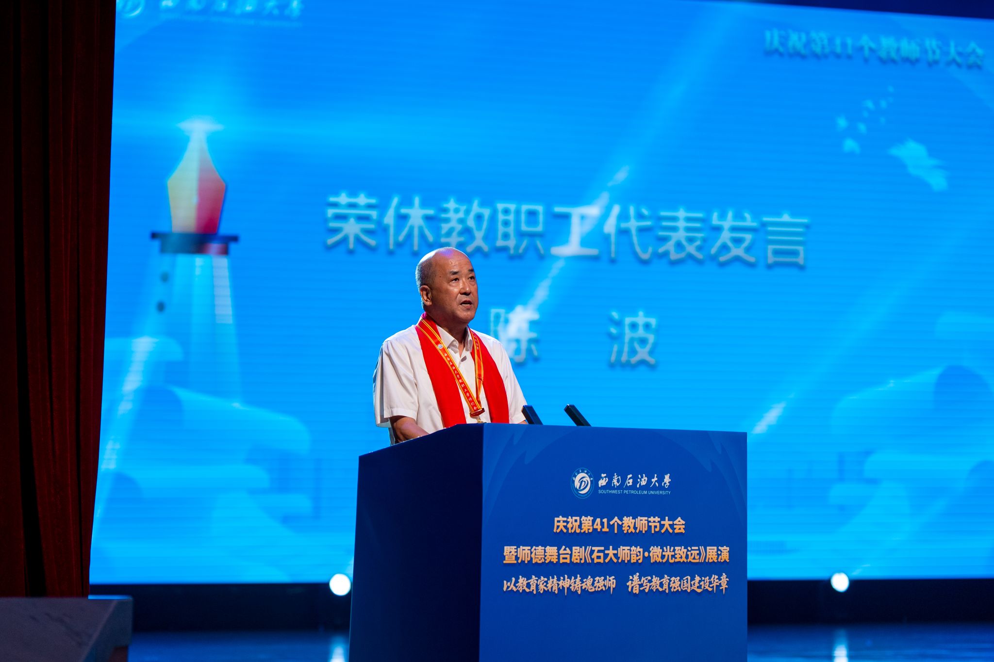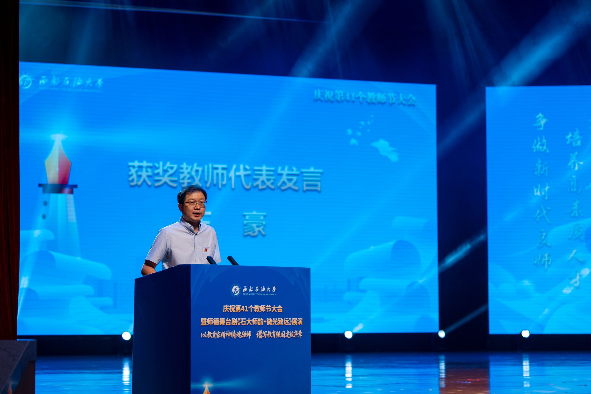 荣休教职工代表、机电院教师陈波深情回顾了自己37年扎根讲台的动人故事;获奖教师代表、化工院教师王豪分享了用“坚持”和“坚信”坚守育人初心使命的故事;新进教师代表、外语院教师程元晨立志要争做新时代“四有”好老师。学生代表、石工院2023级博士研究生周念涛表示要投身强国建设,以实际行动报答师恩。