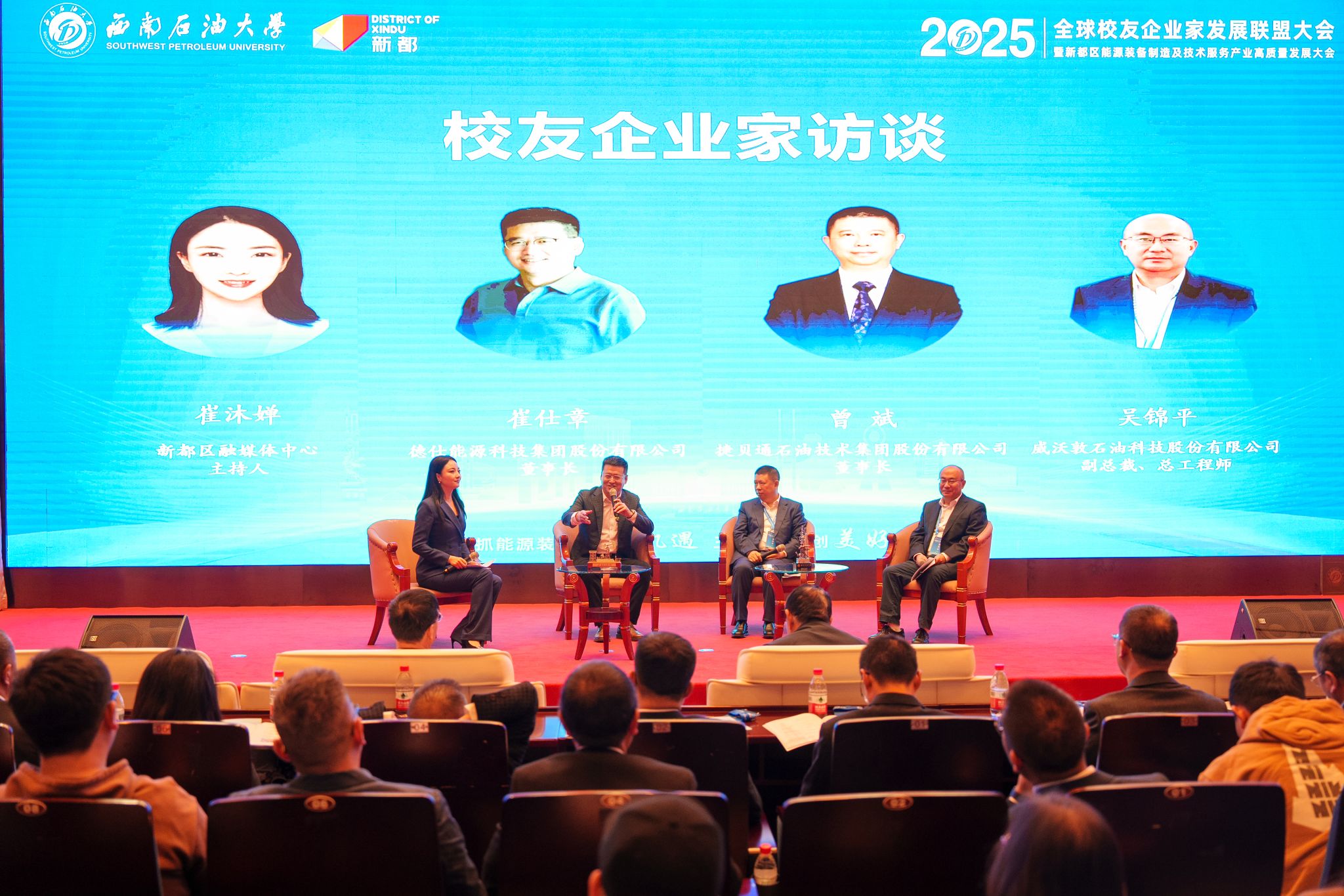校友企业家访谈环节中,曾斌、崔仕章、吴锦平围绕校地企“三向互动“进行了分享。在曾斌看来,高校科研成果是企业技术创新的重要源泉,他感谢母校和新都区对企业发展给予的帮助;崔仕章认为产区优势与人才保障是企业发展的重要引擎,并点赞校地在企业升级过程中所提供的高效举措。吴锦平表示,长期以来校企双方合作密切,希望依托学校技术、人才高地优势,在数字化、智能化等方面发力,增强产业体系生命力。