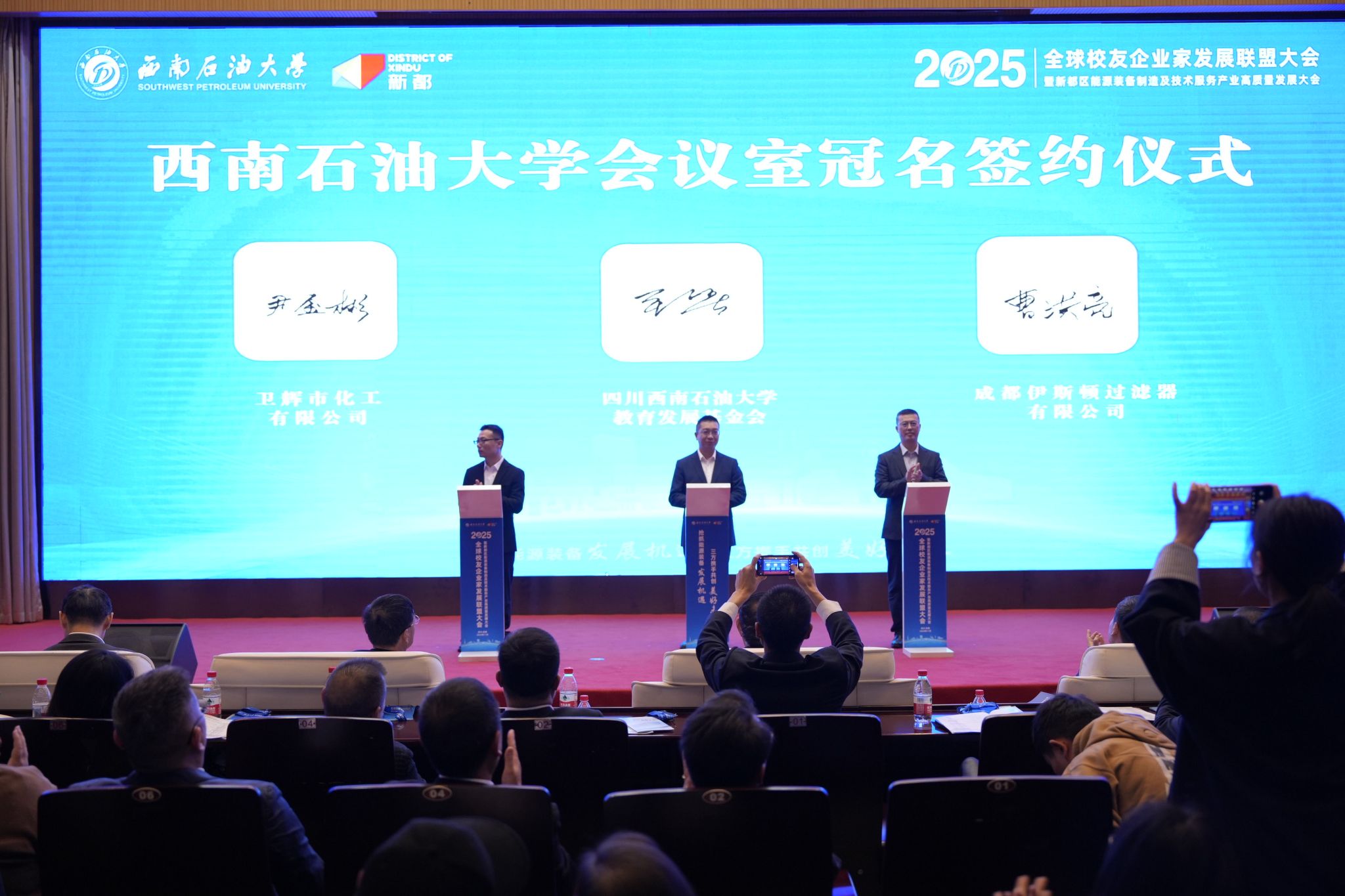 新都区委办公室、区政府办公室、香投集团、新投集团、区发改局、区经信局、区投促局、区新科局、交管委、区科协、区人才发展中心、新都街道主要负责同志,全球校友企业家发展联盟会员单位代表,各地校友组织代表,高校校友企业代表,我校党政办、科研院、社科处、招就处、双创中心、科技园等单位负责人,各学院院长、分管科研副院长,师生代表参加大会。