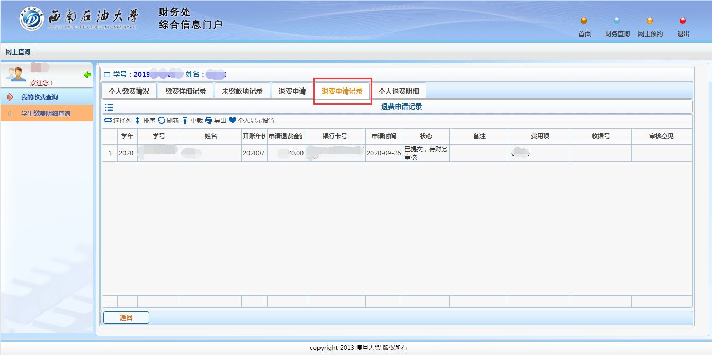 进入【退费申请—申请退费】,填写本人收款银行卡信息,提交申请,财务审核通过后退款。