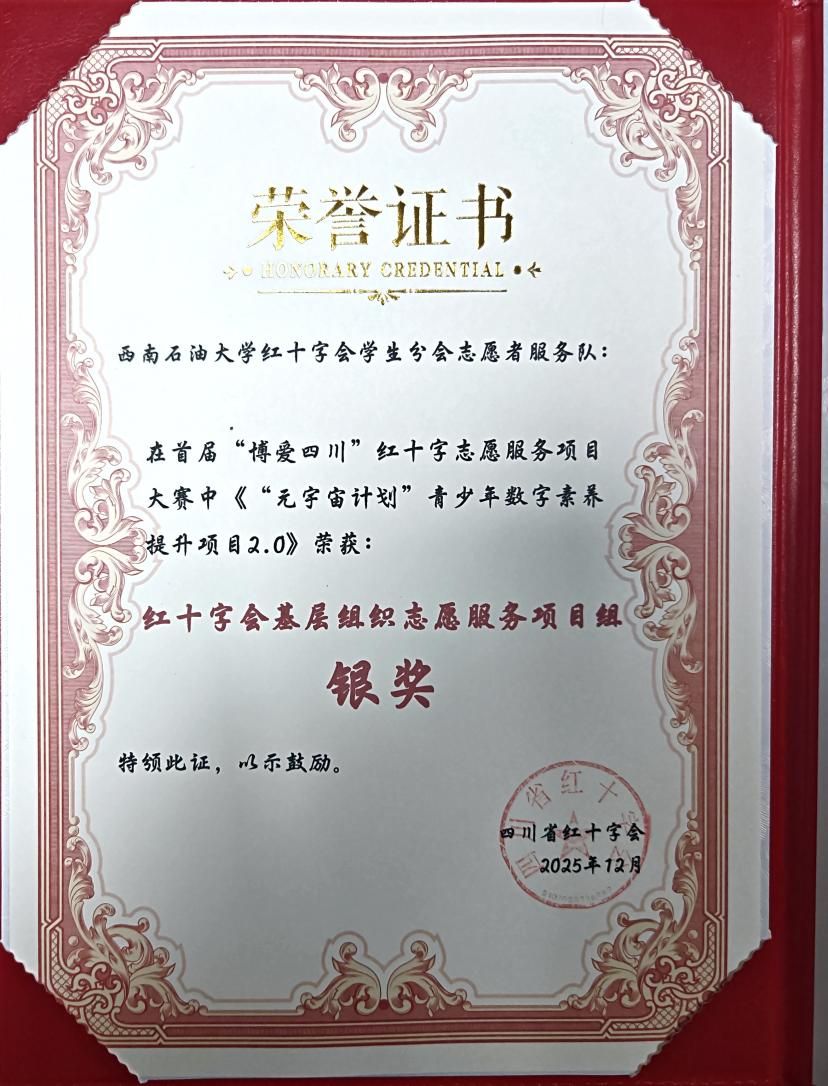 12月1日,由四川省委社会工作部、四川省红十字会主办,封面新闻承办的红十字志愿者“爱”的分享会暨首届红十字志愿服务项目大赛风采展示活动在成都举行。活动现场展示了24个四川红十字志愿服务获奖项目,由校医院申报的“数智赋能·星火聚力”校园黄金急救圈守护计划、校团委及计科院联合申报的“元宇宙计划”青少年数字素养提升项目2.0,双双荣获大赛银奖,并入选“四川省红十字志愿服务项目库”。