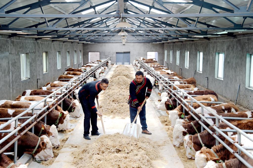 李凯(左)与三河村大学生返乡创业青年洛古有格在养殖场一起劳动。