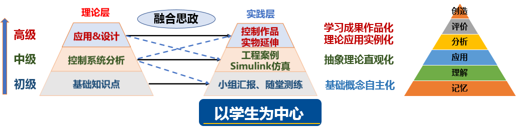 以控制系统案例贯通教学内容,结合智能车转向控制、机器臂关节控制等案例串联主干知识点,同时引入自动化学科前沿技术,将实践环节引入课堂,通过课堂仿真、实物实践、二课延伸,实现理论与实践的融合。从榜样力量、大国重器、社会热点等角度挖掘课程的思政元素。